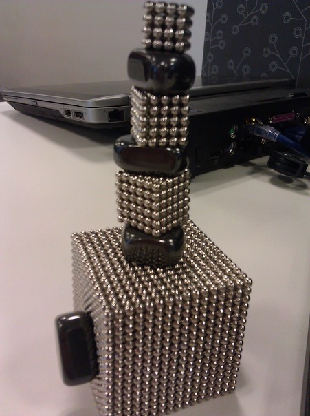 Shiny metal balls are used to build a structure, the balls at the top are larger.