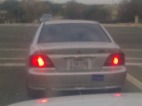 a car is on a road have stop for a signal its danger lights are blinking |