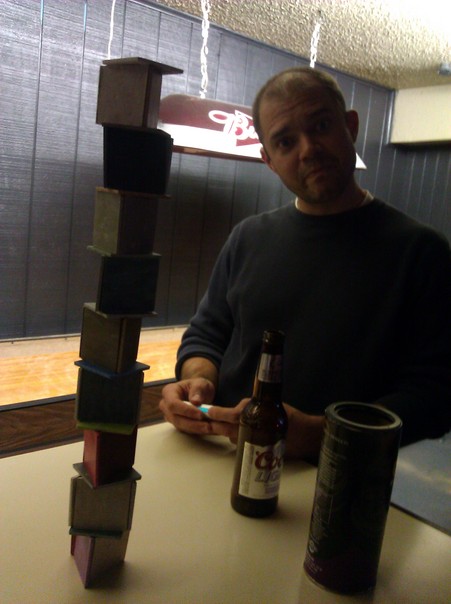 A balding man is looking into the camera, he has a Coors light in front of him, and a bunch of blocks stacked up. |
