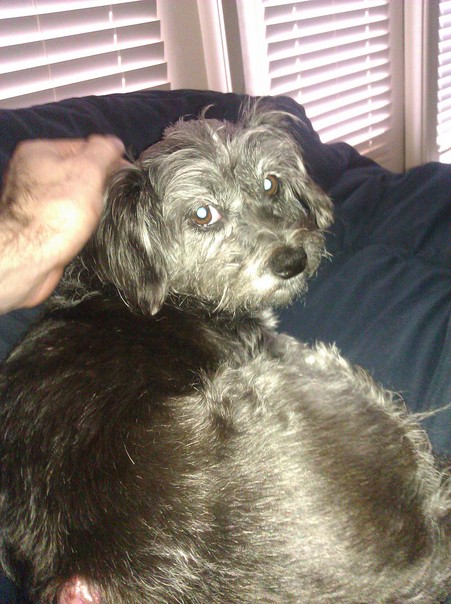This fuzzy little terrier mix appears to be a bit unsure about the man who is about to pet him, as evidenced by the wary look on his face. |