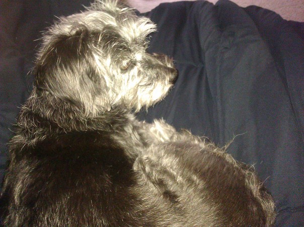 A small short-haired gray dog sleeping on a black blanket. |