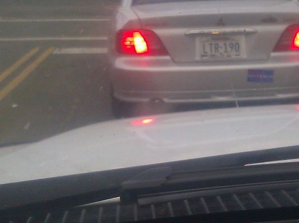 White license plate with black letters and bright red tail lights on the rear of a car. |