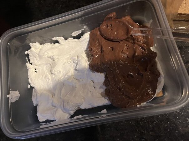 Line 4 graham crackers on the bottom of a glass pan. Make some homemade whipped cream (2 cups heavy cream, 4 tbsp powdered sugar, 2 tsb vanilla), and create a hearty layer of the whipped cream above the graham crackers.