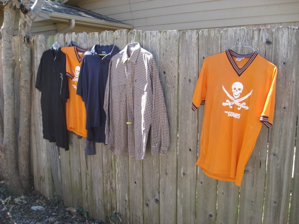 A small assortment and arrangement of some close hung up on a wooden fence.