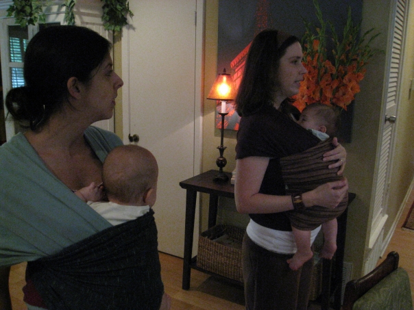 two middle aged woman stand with babies on their fronts as they stare ahead.