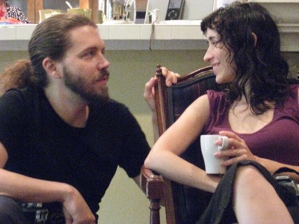guy in a black shirt looking at the woman with the mug in her hand