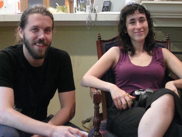 a dark haired woman with a camera in her lap sits next to a man with a ponytail.