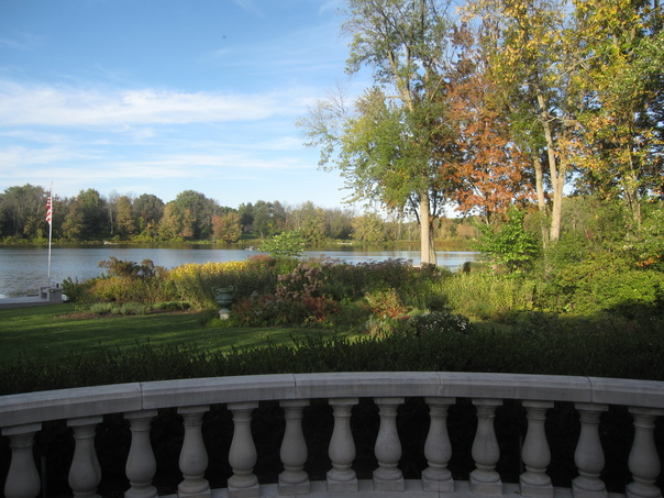 A white balcony overlooking a scenic grassy area and lake. |
