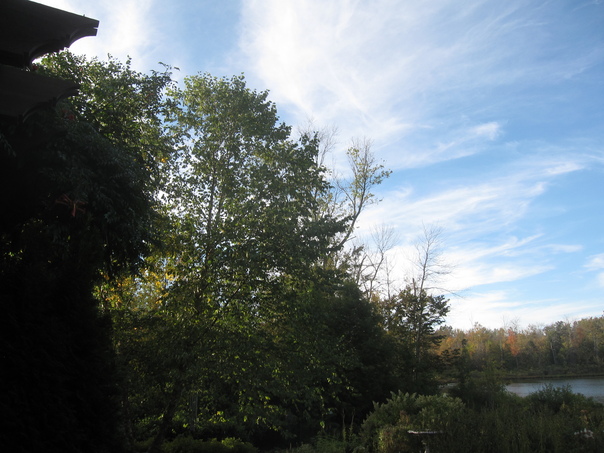 White clouds span across skyline above a clear lake with trees lining the shoreline. |