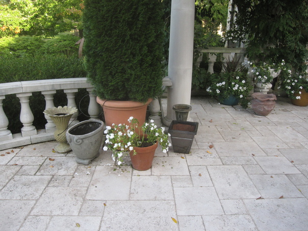 A stone patio with several plants in pots including small plants with white flowers and large cedar shrubs. |