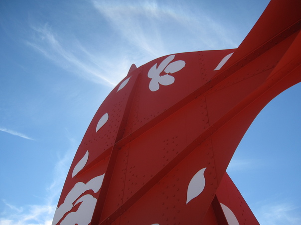 A large metal sculpture is painted red and has white flowers and floating petals on it. |