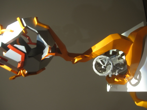 a small plastic sculpture of gray, red, orange, and white. |