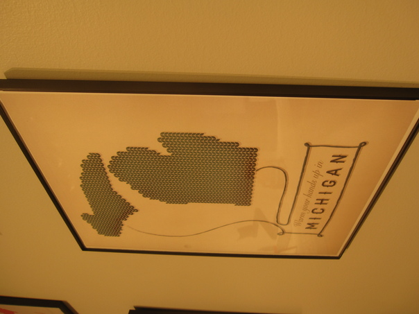 There is a picture that says warm your hands up in Michigan. |
