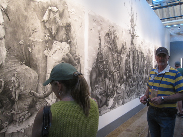 The man and the woman are at an art museum looking at a drawing of an elephant. |
