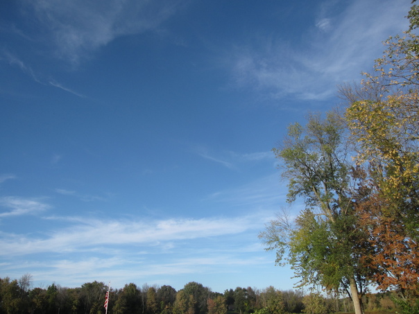 A partly cloudy blue sky in a dense forest area. |