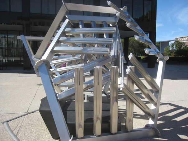 A sculpture made of metal bars is on a cement plaza outside of an office building. |