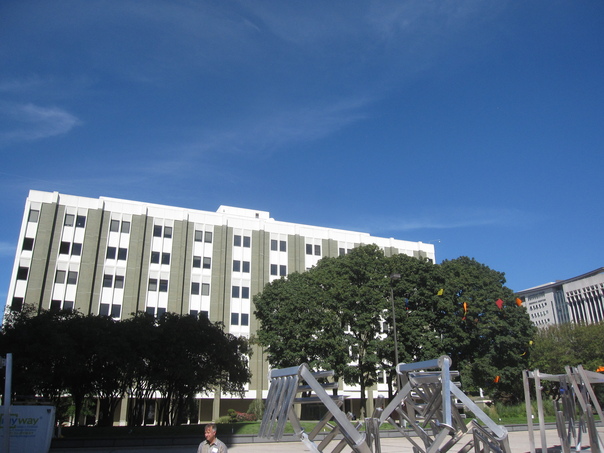 This man walks by a metal apparatus in front of a large white building situated behind green trees. |
