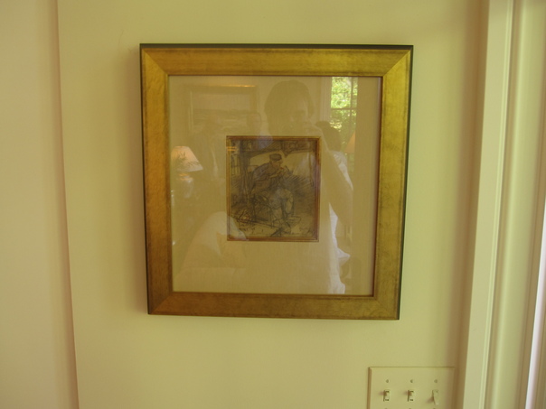A framed picture on a wall above a light switch. |