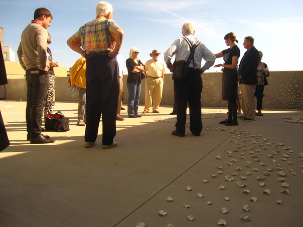 In a desert courtyard, several people listen intently to a young woman speak. |