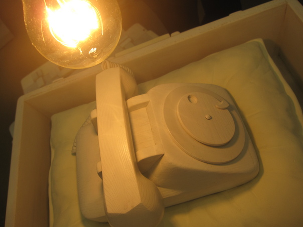 The clear light bulb is illuminating the rotary style phone that is carved out of wood. |