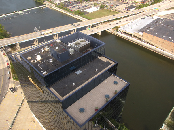 This is an aerial view of the water and the busy roads separating the water in the city. |