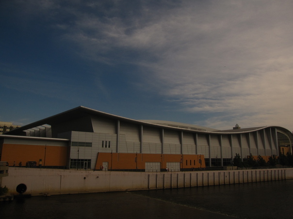 This picture depicts a long, gray building with a curving roof and a white fence surrounding it |