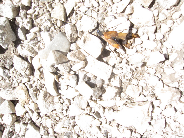 The yellow and black insect does not blend into the white rocks.