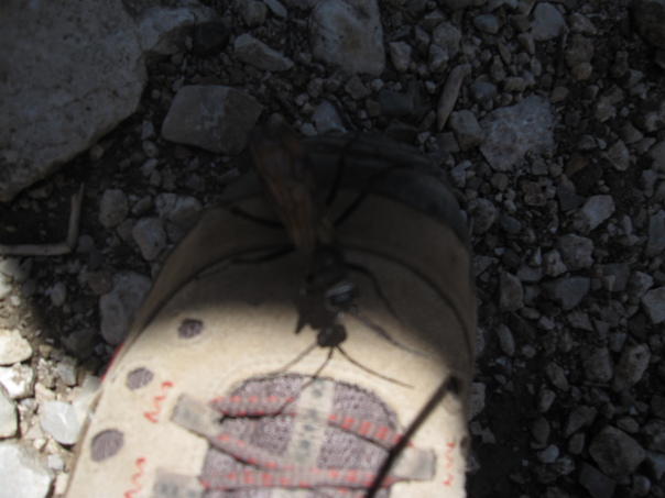 there is a fly sitting on a shoe and the shoe is in the small stones surrounding it