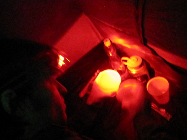 Using only the meager reddish light from his headlamp, a man prepares a simple meal for himself inside his tent.