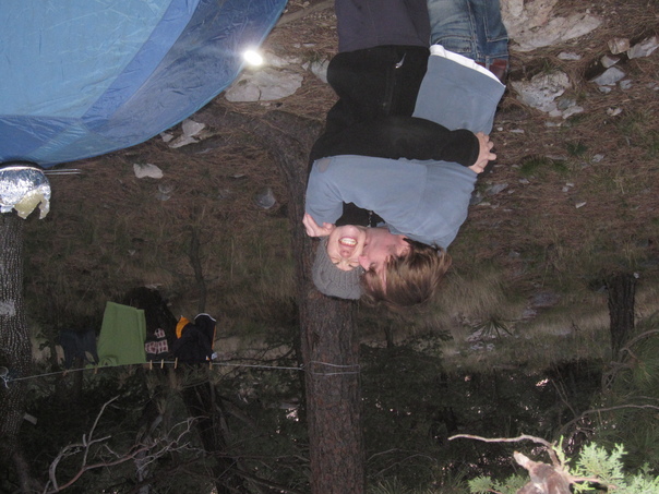 It is an upside down photo of a campground, with a man in a blue sweatshirt tightly hugging a young woman in a gray hat and kissing her on the cheek.