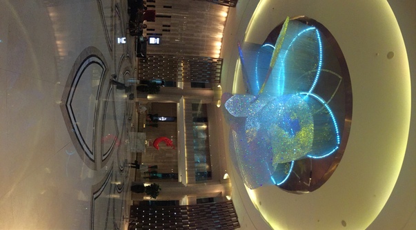 A large illuminated sculpture mounted to the ceiling of a building.