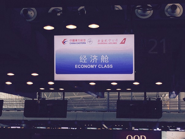 THERE IS A BIG BLUE SIGN THAT SAYS ECONOMY CLASS.