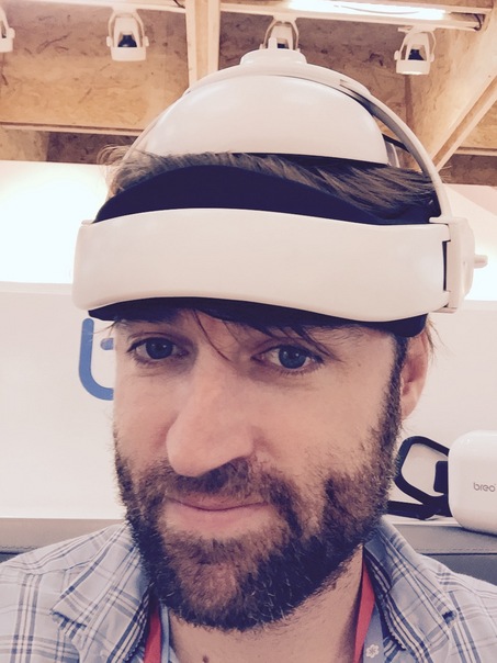 The smiling man with the brown beard had his special helmet on