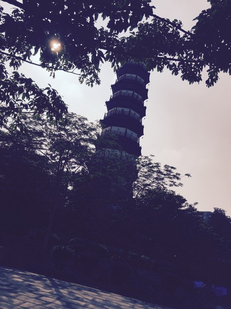 The tree branch is partially obscuring the Asian style tower.