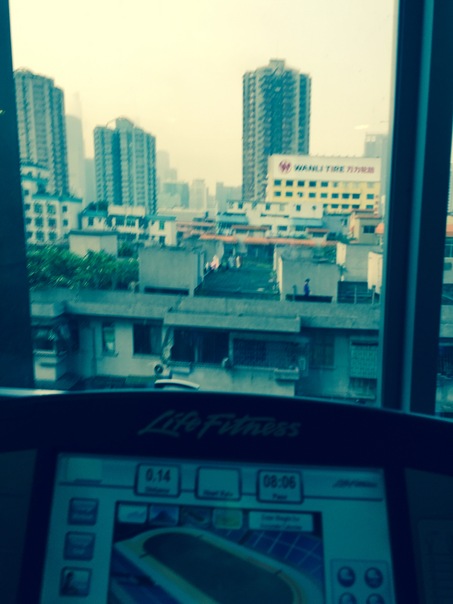 This is the picture on the display screen of a treadmill in a gym over looking a large city.