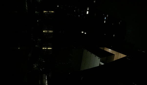 A darkened room, punctuated occasionally by dim, distant lights in the background.