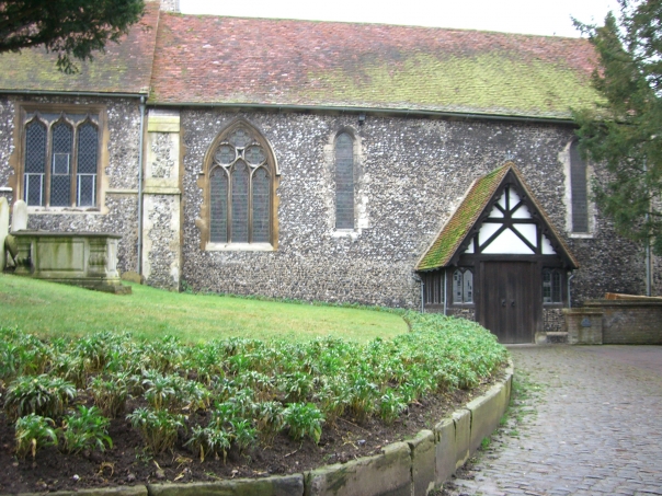 The entrance of what appears to be an old stone church with moss on the tiles roof and a driveway and plants in the foreground.