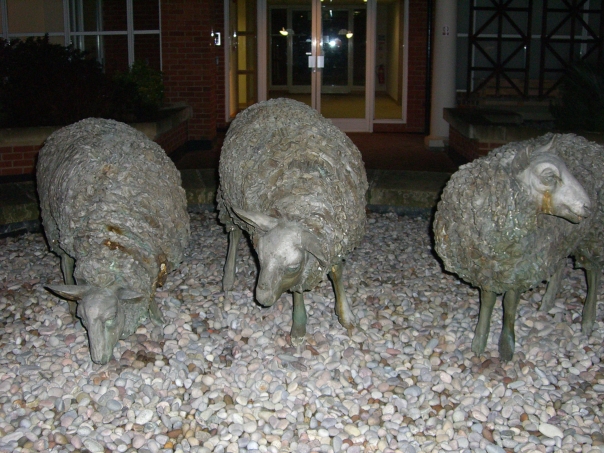 At night scene of three sheep statues placed on rock aggregate in front of a building.