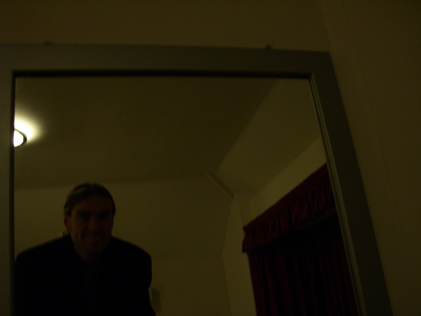 Dark picture, inside a room with white ceiling and white walls that has a window with a red curtain and a man with longer hair wearing dark clothing and smiling.