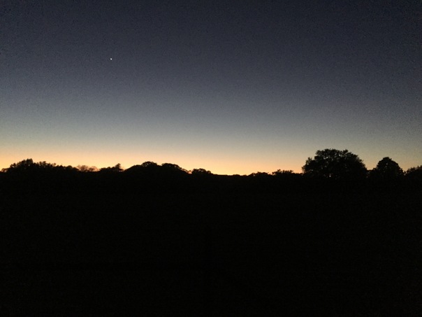 A picture of a horizon of a sunset that is just about done setting. It is of a tree lined area and the sky is a purpleish and pink color.