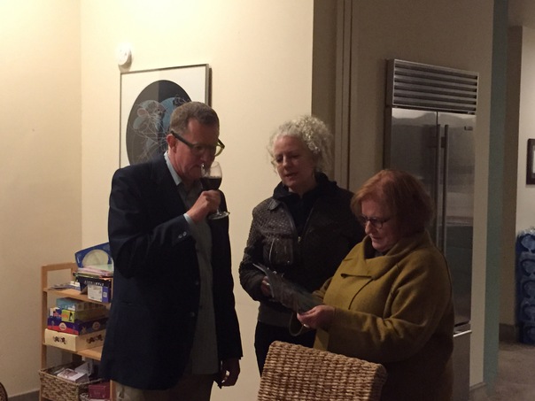 There is a man drinking wine, a woman wearing a black coat, and a woman wearing a green coat.