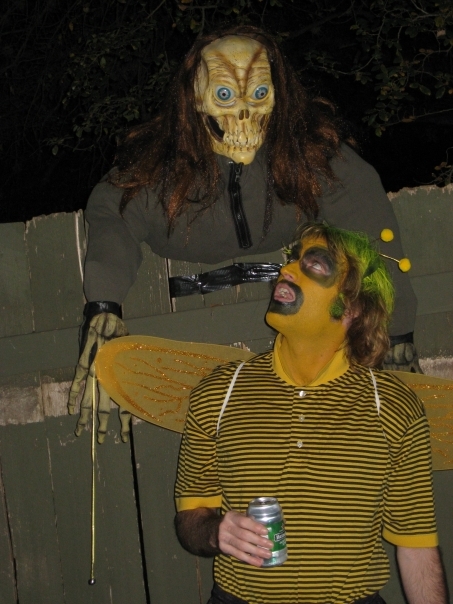 My friend Dustin was going to a Halloween party at his friend Doug's house in Rollingwood and invited Tracy and I to attend it. Tracy dressed up as Sarah Palin. Unfortunately since I hadn't really planned to do much for Halloween, I had to quickly throw something together. I wound up creating some sort of a sad-clown bee, complete with lots of yellow makeup and wings.