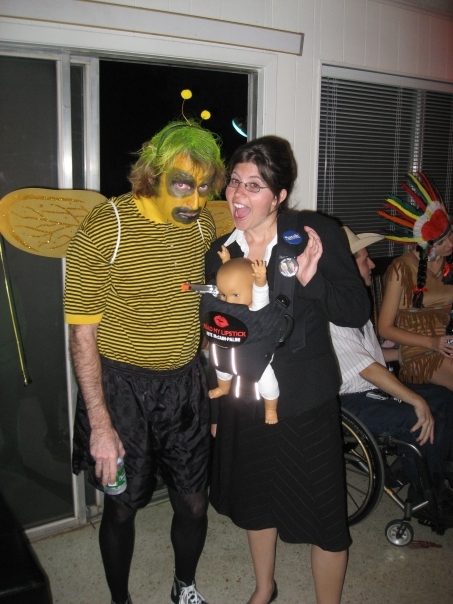 My friend Dustin was going to a Halloween party at his friend Doug's house in Rollingwood and invited Tracy and I to attend it. Tracy dressed up as Sarah Palin. Unfortunately since I hadn't really planned to do much for Halloween, I had to quickly throw something together. I wound up creating some sort of a sad-clown bee, complete with lots of yellow makeup and wings.