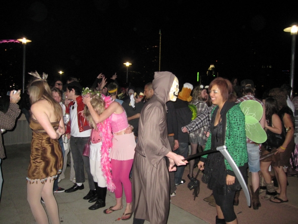 Thirty or more people enjoying what appears to be an outside Halloween party