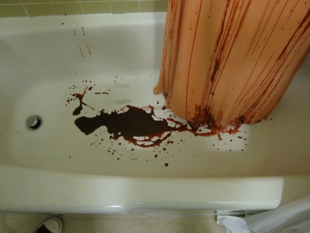 A bathtub with a pool of splattered blood soaking into the bottom of an orange shower curtain.