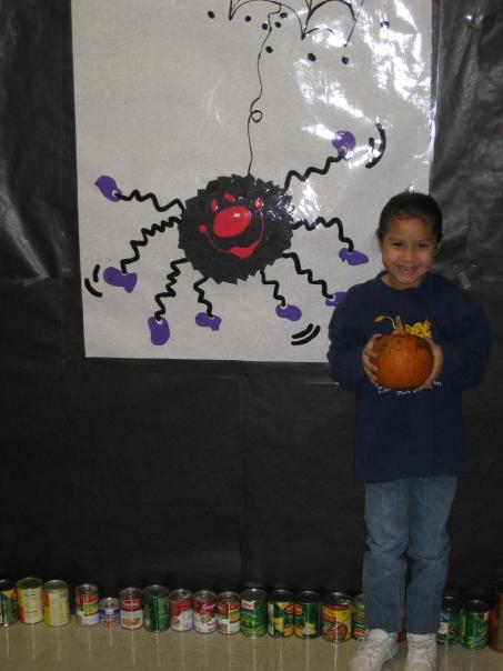 Smiling girl holding pumpkin, spider drawing, canned food line up