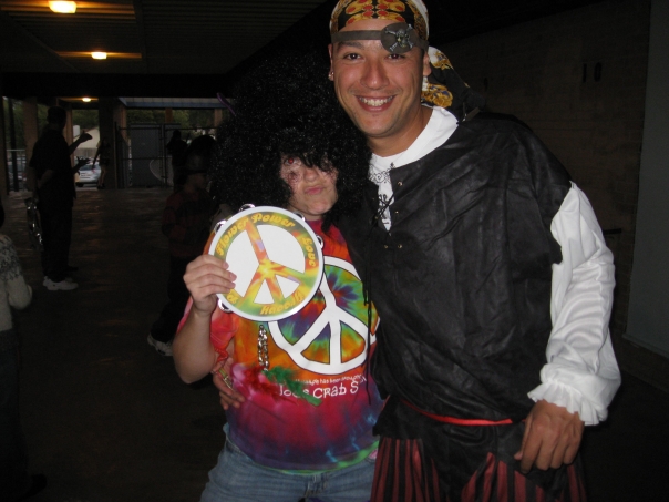 I got invited up to Tracy's school to celebrate their annual Halloween party. Tracy was an afro-hippie of some sort, her friend Megan was a train conductor, Paco was a pirate, and I showed up dressed as an airplane.