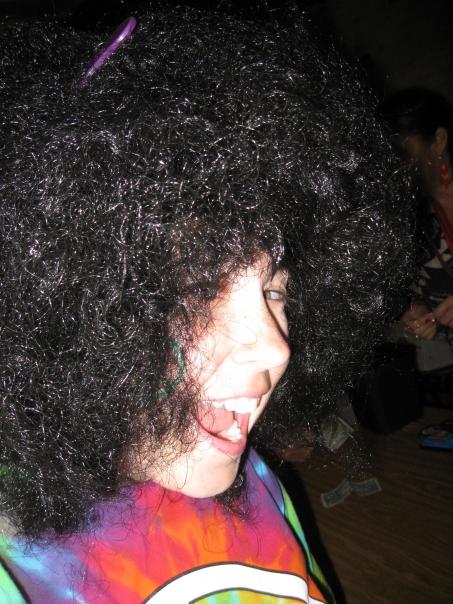 crazy person with a huge black wig on