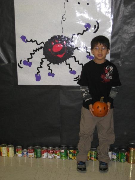 A young boy poses with an orange pumpkin while a straight row of cans runs behind him on the floor.