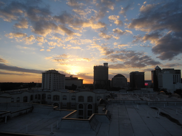A picture of the gigantic skyscrapers during sunrise on top of a building.